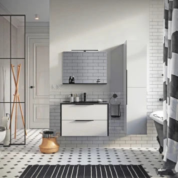 De Atlantic badmeubelset Aria met spiegel en zwarte wastafel 60cm Mat Wit is een hangende set met een industriele uitstraling. Dankzij het hangende design creëer je een ruimtelijke look in jouw badkamer. Het meubel is voorzien van 2 soft close laden en een mat zwarte keramische wastafel. Ook zijn er zwarte profielen geplaatst op de randen van het badmeubel voor een extra stoere look. Daarnaast is aan deze set een losse vierkante spiegel met planchet toegevoegd. De set is voorzien van stijlvolle mat zwarte grepen, wat zorgt voor een chique en industrieel uiterlijk. De set wordt flatpacked geleverd en is eenvoudig te installeren met de meegeleverde bevestigingsmaterialen. Exclusief wastafelkraan.