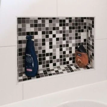 Mozaïektegel met een marmerlook en een combinatie van zwarte en witte steentjes. De verschillende kleuren zorgen voor een speels effect. Geschikt voor wand in de badkamer en toilet. Kan gecombineerd worden met een witte wandtegel.