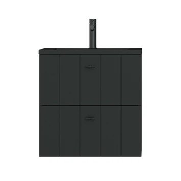 Landelijk design in een modern jasje. De Tiger Maryport wastafelonderkast van 60 cm in mat zwart zorgt voor een luxe, sfeervolle look en houdt badkamer en geest opgeruimd. Deze volledig voorgemonteerde wastafelonderkast heeft 2 ruime lades met softclose geleiders om al je verzorgingsproducten overzichtelijk in op te bergen. De half voorgeboorde gaten voor de matzwarte grepen zorgen voor een eenvoudige montage. De look wordt compleet dankzij de matzwarte polybeton wastafel met natuursteen uitstraling.